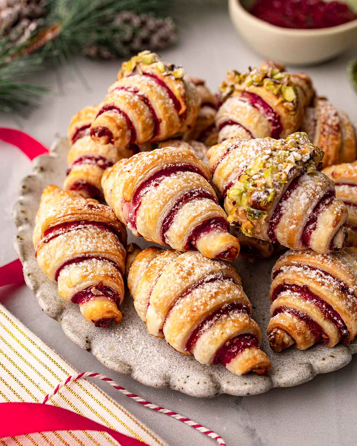 Stack of raspberry jam puff pastry croissants dusted with powdered sugar on plate.