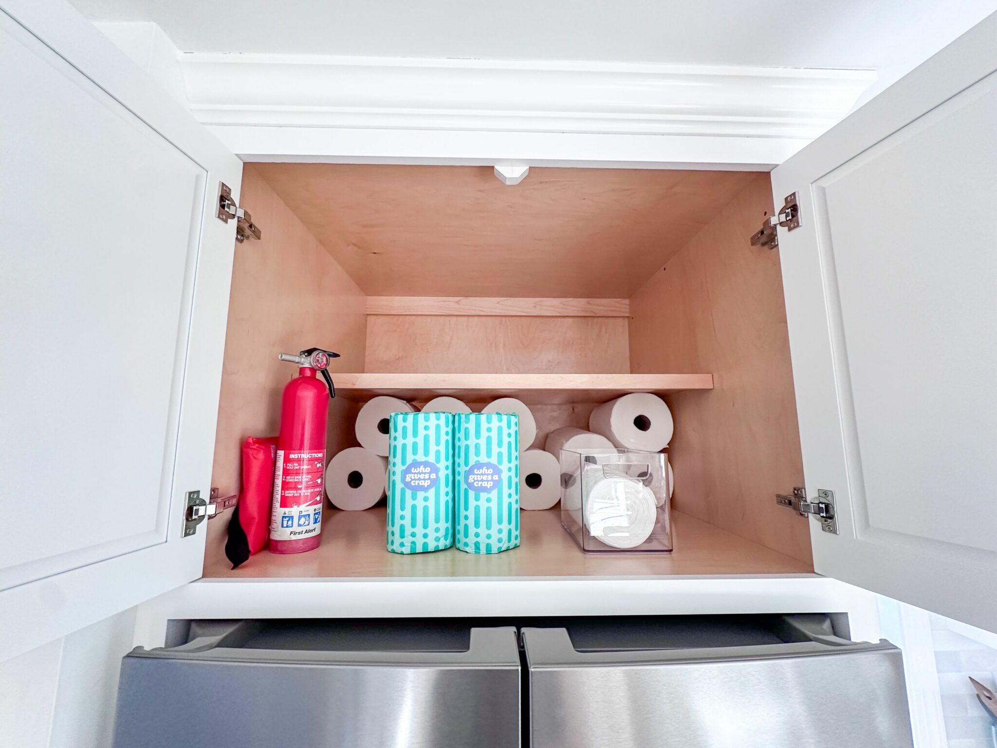 - Put extras like bulk paper towels and extra trash bags in another lower real estate spot – like above the fridge.