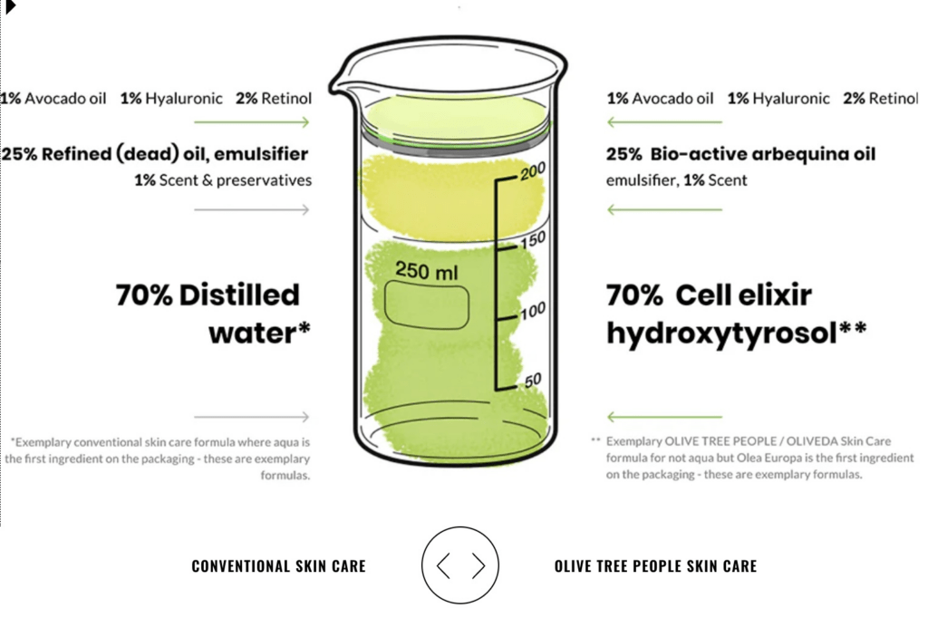 Oliveda replaces water with olive leaf extract, which means every product delivers antioxidants, polyphenols, and skin-supportive nutrients from the first drop. Without water, Oliveda eliminated the need for preservatives and developed products with a much higher percentage of bioactive ingredients. In lieu of refined oils, the products contain Arbequina oil from olive trees.