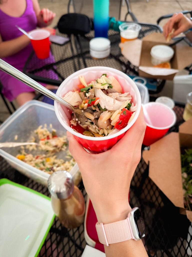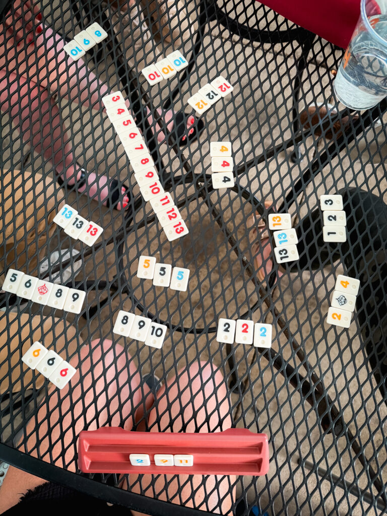 We also love Fridays, the outdoor concerts at the downtown pavilion all summer. I brought orzo salad and solo cups to share. And Rummikub of course! It goes wherever I go. I put an Airtag on Birch and let him frolic!
