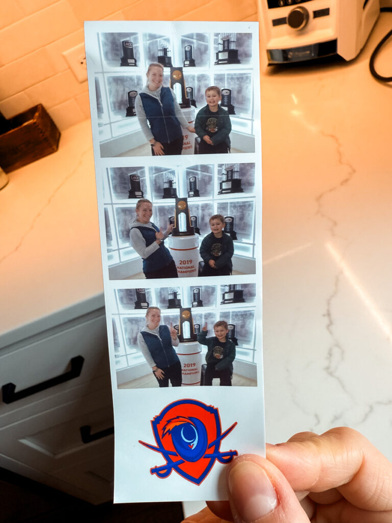 Birch doesn’t love going to games quite yet, so we went for a walk. Found a photo booth in the trophy area!