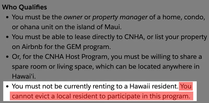 One nonprofit that also leased properties was more proactive in trying to prevent profiteering by landlords. The Council for Native Hawaiian Advancement, a prominent local nonprofit, ran the only nongovernmental leasing program after the fires. On the online application for its program, property owners had to attest that they were not evicting anyone in order to house survivors. They had to say what type of rental property they had and whether it was furnished. And if a landlord said a property was a short-term rental, staff tried to verify that through property tax records or Airbnb listings.