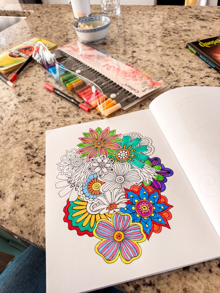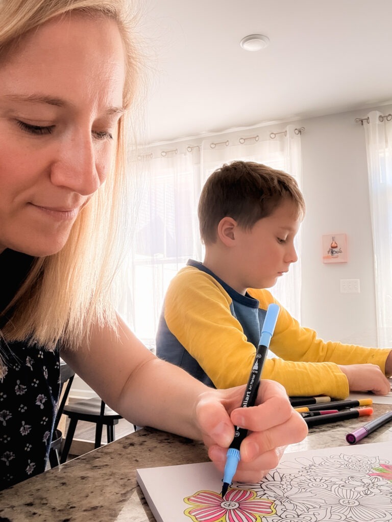 Indoor activities – B is really into coloring and I am so happy! I love to sit and color. He draws pirate ships and Harry Potters, and I have an adult coloring book I’ve been working through. I got him this new marker set, and it’s fabulous!