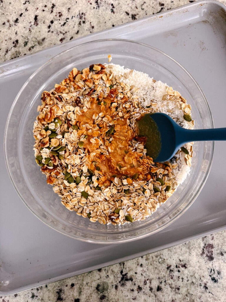 In a large bowl, combine the dry ingredients including oats, chopped walnuts, pumpkin seeds, sunflower seeds, and coconut. Mix well so everything is evenly distributed.