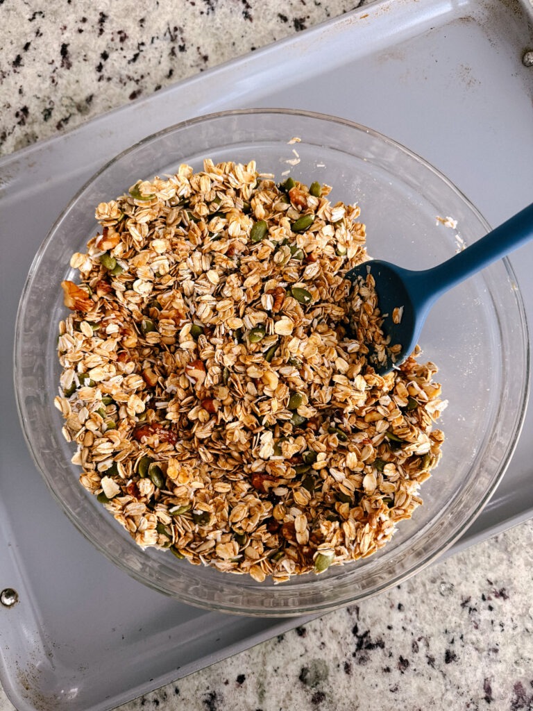 Bake the granola for about 30 minutes, stirring halfway through so it browns evenly.