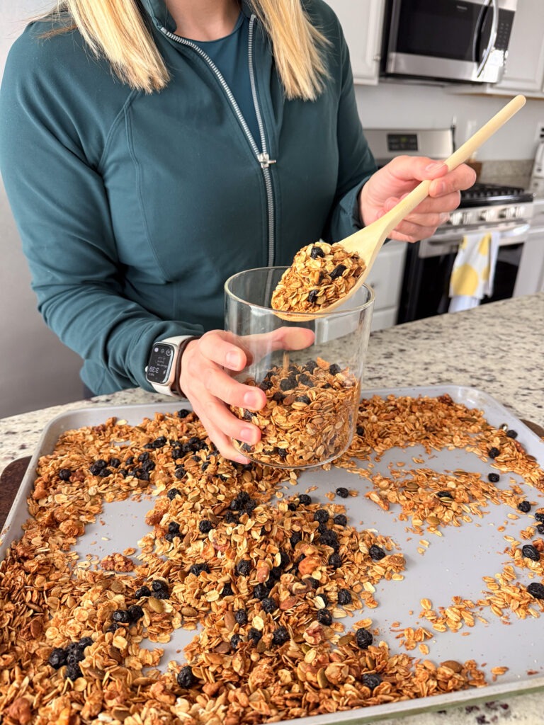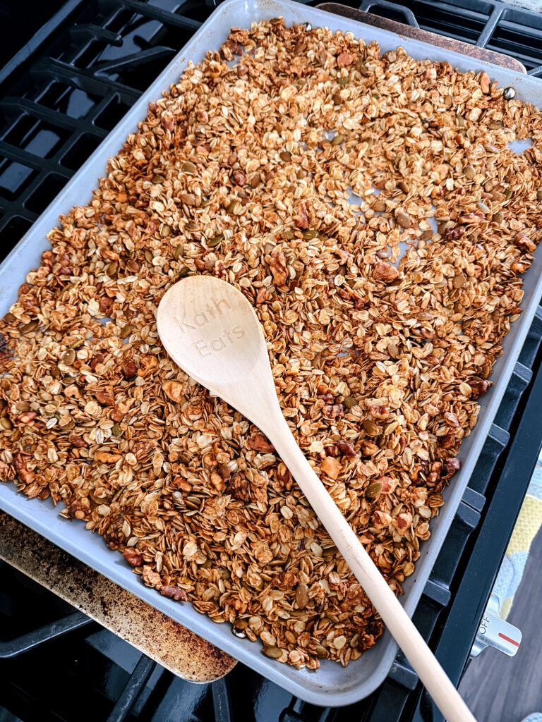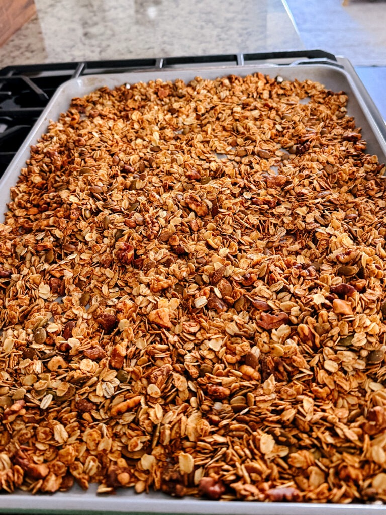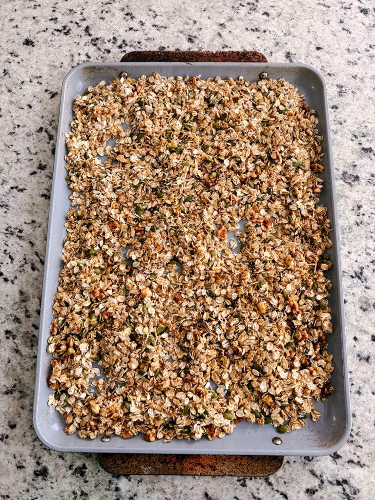 While there are tons of healthier store-bought granolas on the market, once and I while I enjoy making a large batch of granola at home, especially if I’m hosting company. Making it yourself lets you control exactly what goes into it. You can choose your favorite nuts, seeds, and dried fruit, adjust flavors, and make it as sweet or salty as you wish!