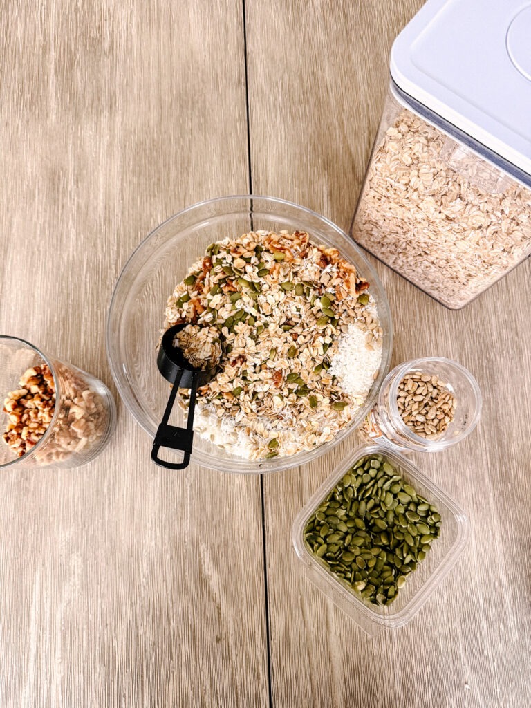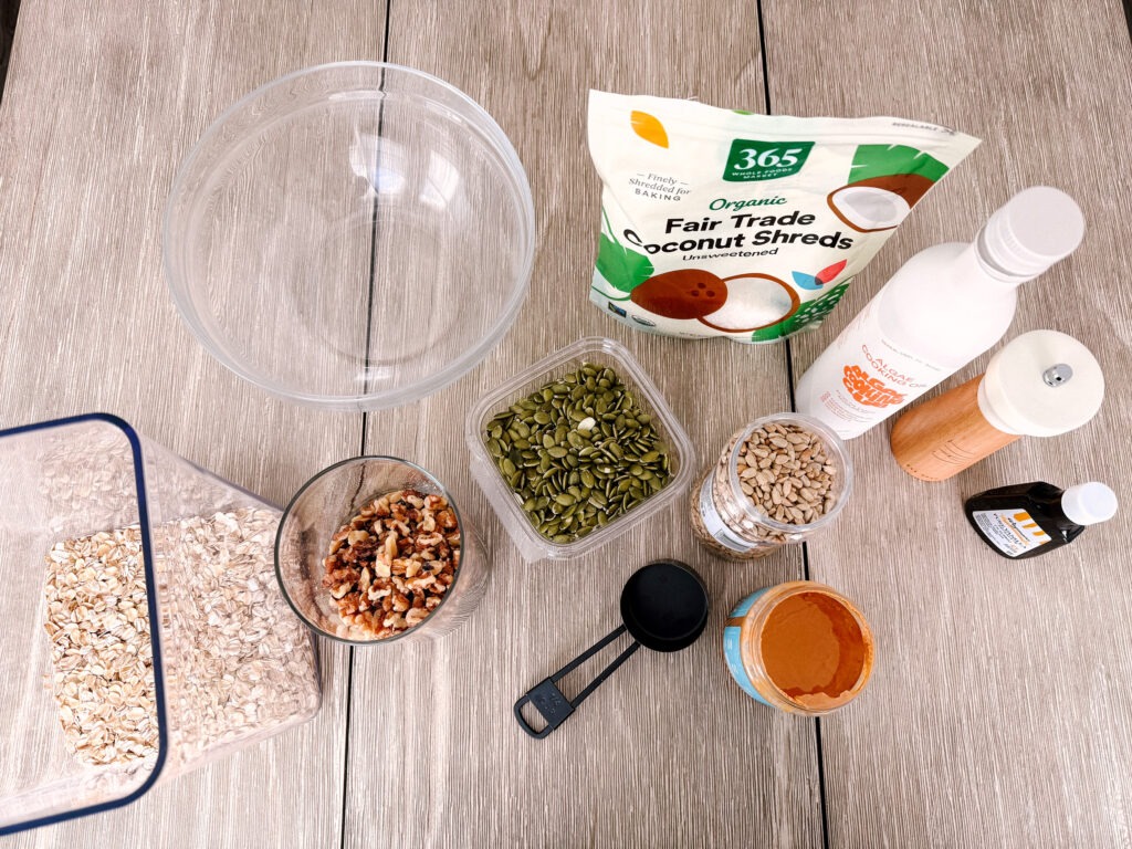 Rolled oats are rich in fiber, particularly beta-glucan, which can support heart health and help maintain steady blood sugar levels. Nuts and seeds like walnuts, sunflower seeds, and pumpkin seeds provide protein, fiber, and healthy fats that keep you feeling full and energized, plus other vitamins and minerals. I’ve also included shredded coconut, which adds texture and additional healthy fats.