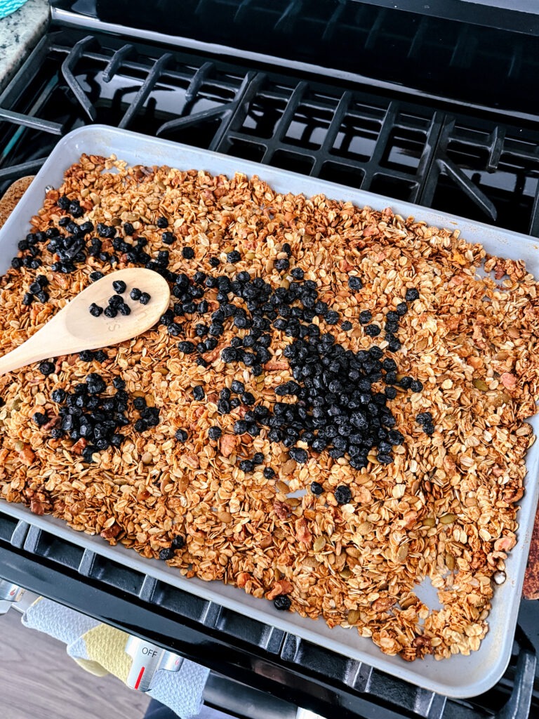 Remove the granola from the oven and allow it to cool completely to room temperature. Once cooled, stir in the dried fruit such as dried cranberries or dried cherries. If desired, add chocolate chips at this stage.