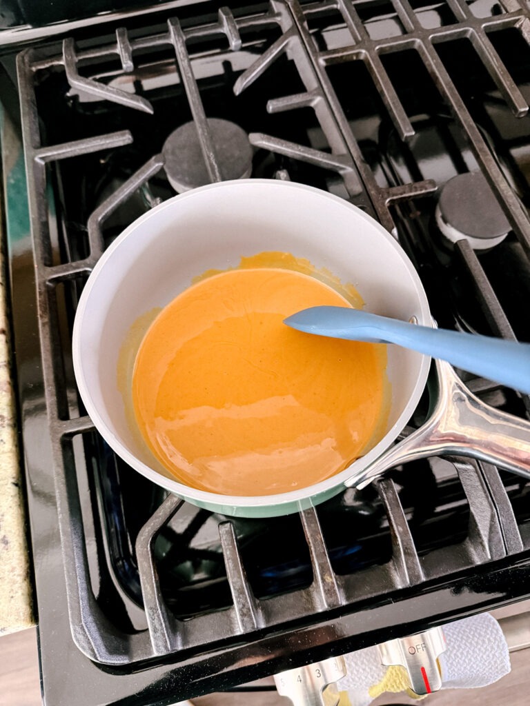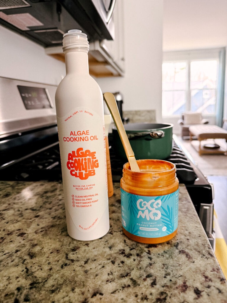 I used Cocomo Peanut Butter, which is quite liquidy and has a coconuty flavor to it (it’s delicious!) But you can use any nut butter you like. The thicker nut butters will require a little longer and perhaps a little more oil to turn all the way into a liquid. If your nut butter is on the liquidy side already, you could probably skip the heating step – just mix it well with the oil first. I also used Algae Cooking Oil, but you can use canola or coconut.