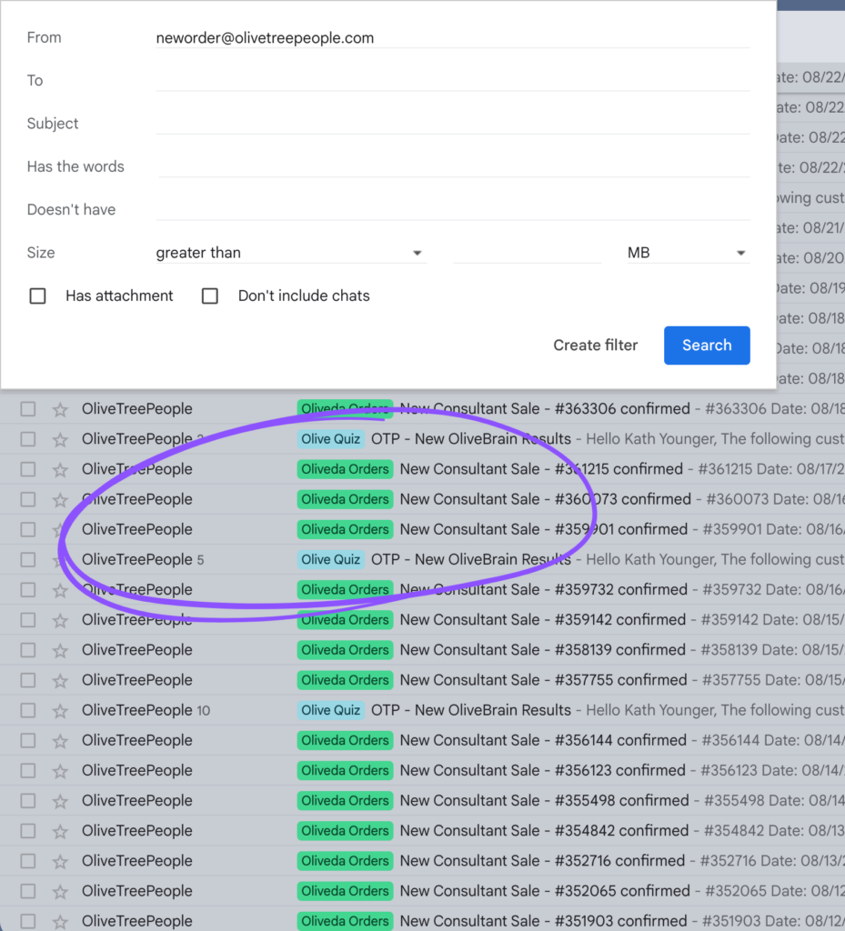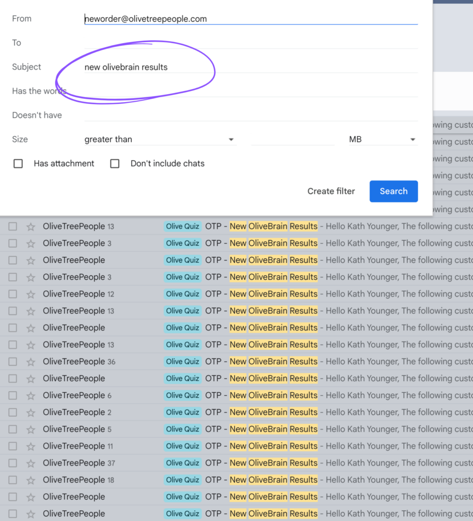 To check your work, hit search. You can see when I hit “create filter” on the specific email, it defaulted to the sender. I had to further clarify in the search criteria that I only wanted the quiz emails to be a part of this filter, so I added the subject line to distinguish.