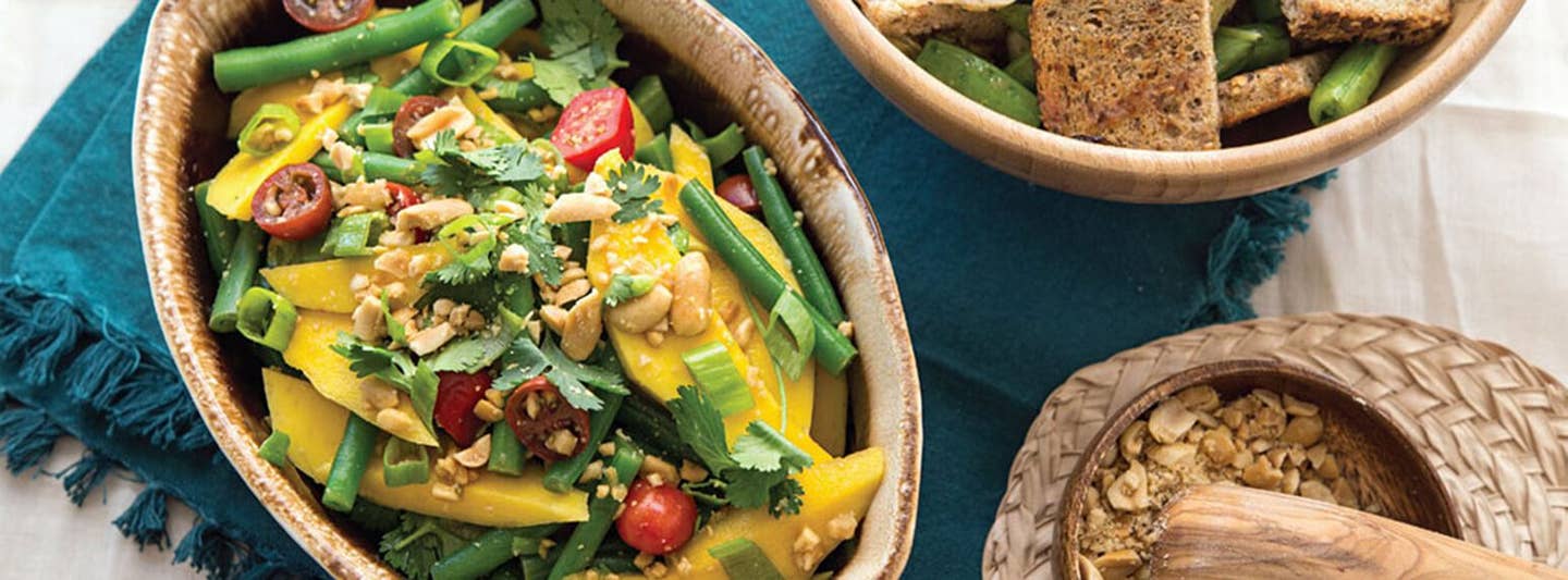 This party-worthy side dish makes excellent use of fresh summer ingredients. Tender green beans, tangy cherry tomatoes, and slightly under-ripe mangos combine perfectly in this scrumptious salad that’s greater than the sum of its parts. Fresh Thai chili adds heat to the lime dressing, while a few chopped scallions and peanuts sprinkled on top deliver another layer of flavor and texture. A reviewer writes, “Really loved this salad, even though I changed peanuts into borlotti beans. The mango and cilantro taste so good together, and I didn’t need the sugar in the dressing.”
