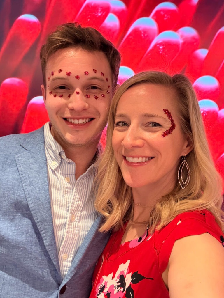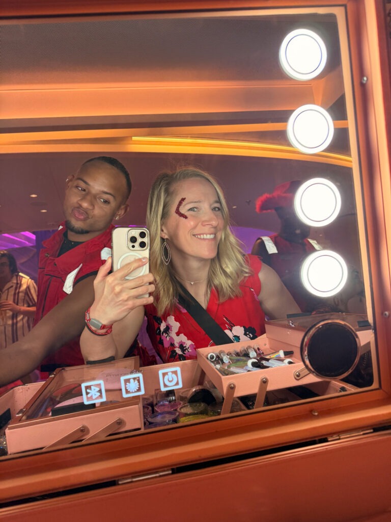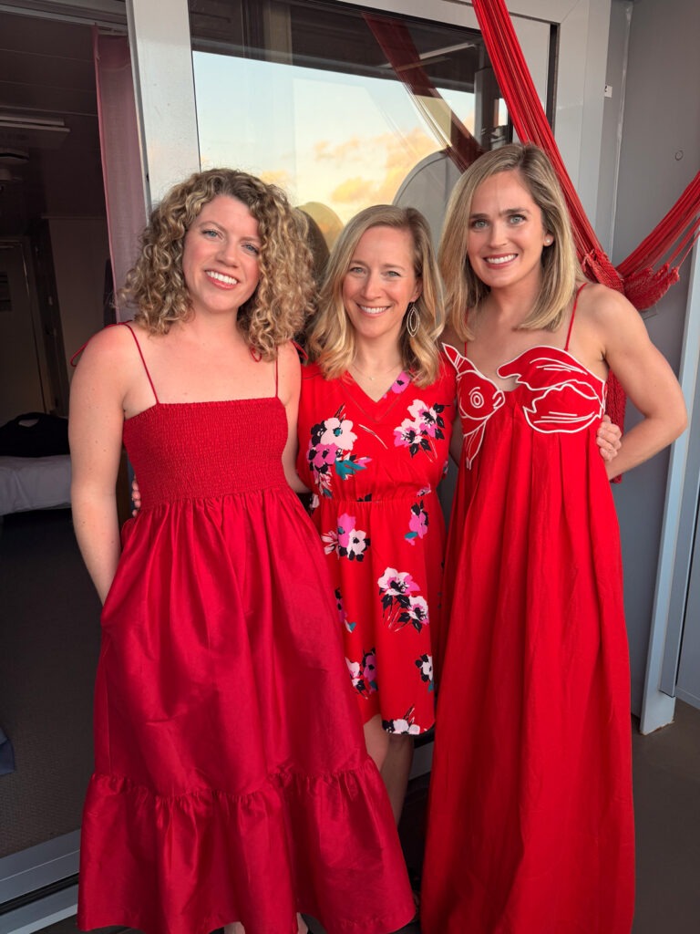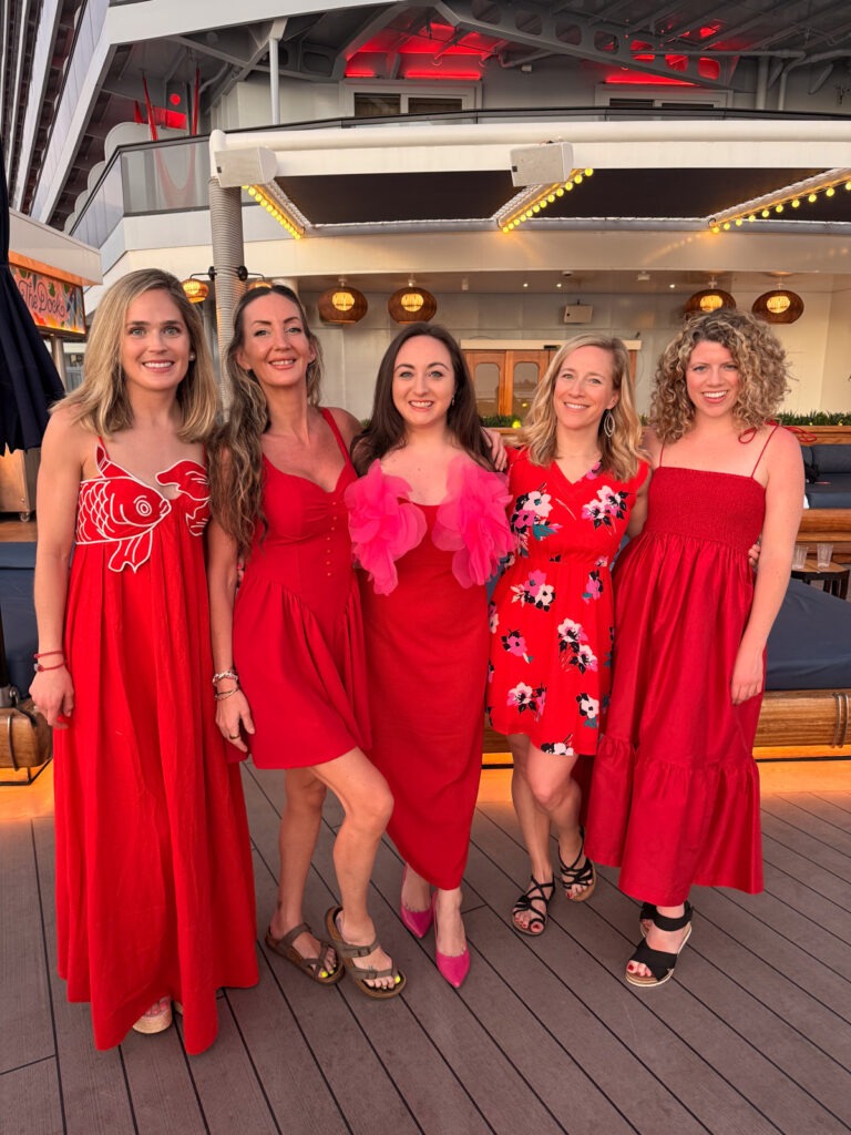After naps and showers, we gathered for Scarlet Night. This was by far the highlight of the cruise for me. The whole ship transforms into RED from the lighting to the videos in the hallways to the giant squid on the pool deck. Plus everyone wears red. It was such a vibe!