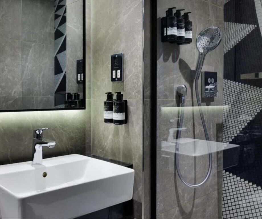 Our bathroom favoured black-and-white patterned wall panels rather than an army of tiles, a modern alternative that gave it a bold, vibrant look. The rainfall shower also had a second detachable head, and the toiletries came from Argentum, a luxury British skincare and fragrance brand.