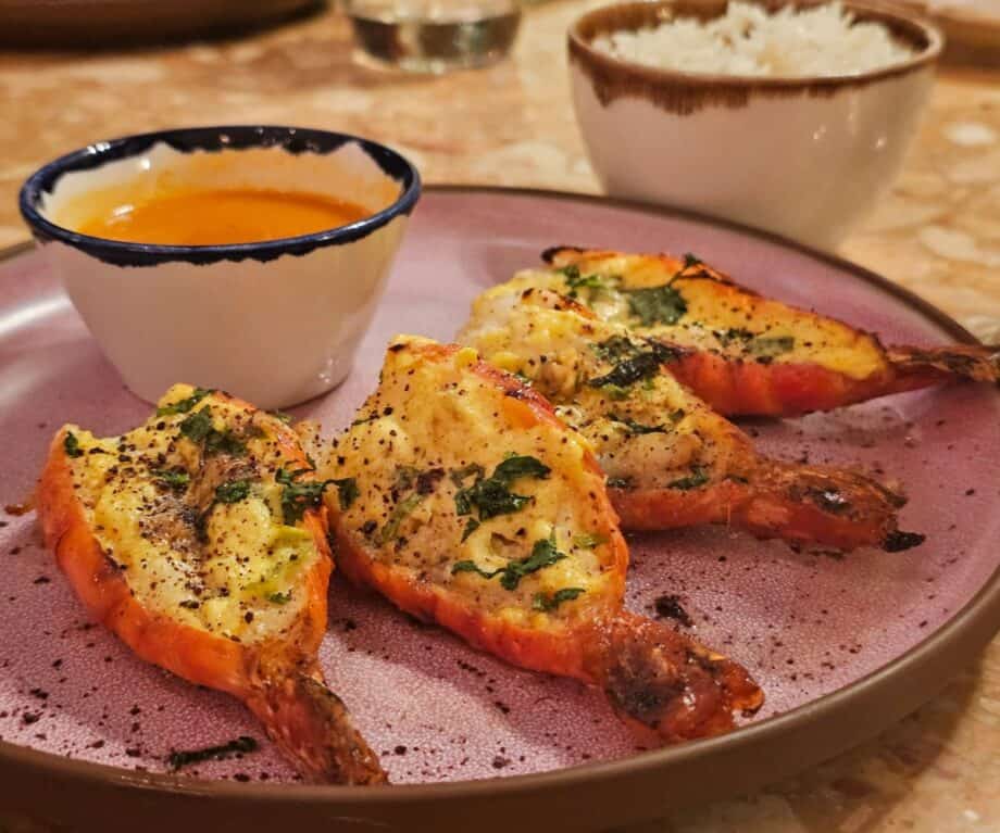Other dishes we enjoyed included an aromatic Lucknowi chicken biryani served with burhani raita; masala grilled salmon crowned with a dried-lime chilli crumble and a crisp celeriac salad, the house black lentils, and – last but by no means least – the visually impressive grilled king prawns in a Colombo curry.