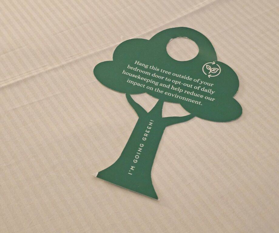 The hotel also offers a sustainability option: a small green tree you can hang outside your door to opt out of daily housekeeping — a simple way to reduce environmental impact yet still offer fresh towels if needed.