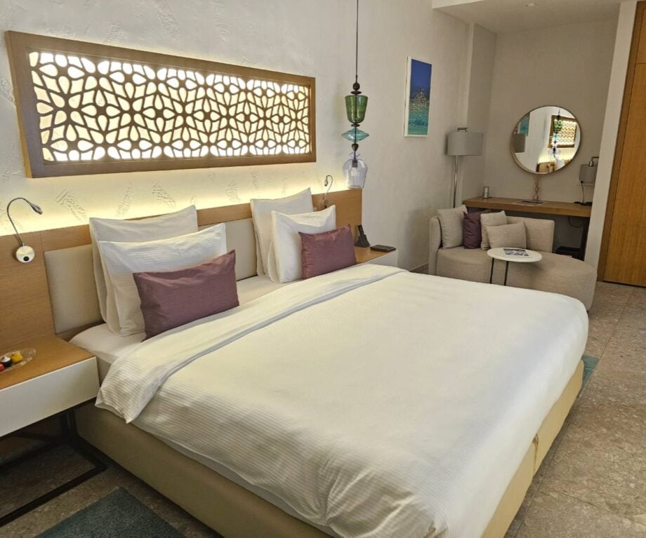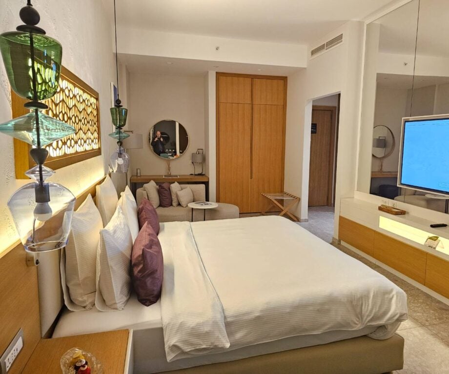 I stayed in Room 3010, a Grand Deluxe sea-view apartment, with a king-size Simmons “Sweet Sleeper” bed (crisp white linen, of course) anchoring a large space that’s designed with a quiet, deliberate precision.
