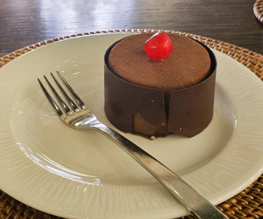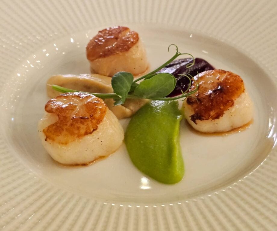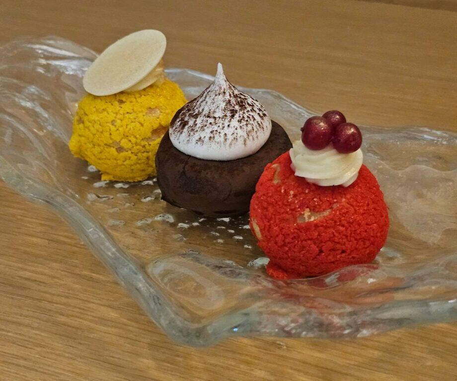 This was followed by a succulent starter of seared Adriatic scallops, crispy chicken skin, rooster reduction and purée trio (celery, broadbeans and peas, beetroot), a main of grilled monkfish served with smoked mussels, kale and proscuitto, a herb and root blend sauce, and leek crisps, and a dessert – it would have been rude not to – of Black Forest cake, consisting of vegan chocolate, coconut ganache, cherry compote, and vegan chocolate sponge.
