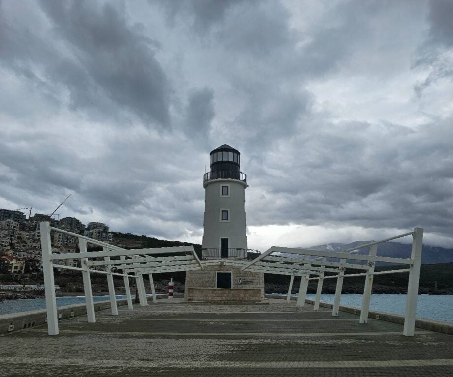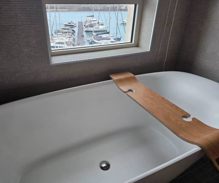 There’s a small table by the window and a balcony with table and chairs that look out over the marina and the distant lighthouse; mornings on that balcony are quietly restorative.