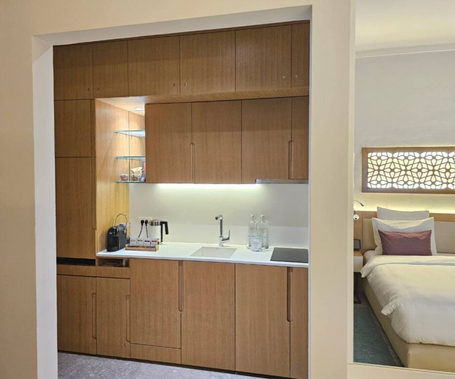 At the entrance a compact kitchenette offers tea/coffee facilities, a two-ring hob, a microwave, dishwasher and a fridge/minibar — useful for light cooking or for pacing meals after a long day of travel.