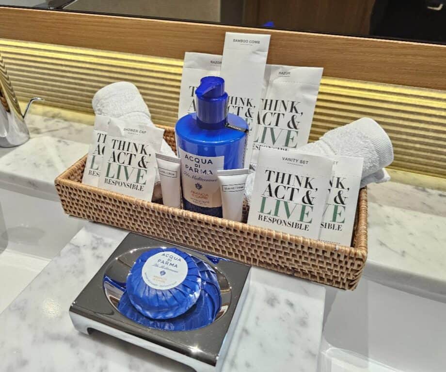 The hotel supplies Acqua di Parma toiletries and a small tray of other amenities (bamboo comb, vanity set, shower cap, shaving kit), and the thoughtful presence of soft robes and slippers make trips to the spa easier and more indulgent.