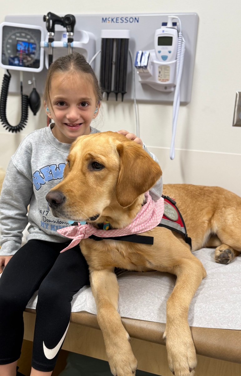 When she goes for checkups at a hospital in Charlotte, North Carolina, Ollie sometimes gets a visit from a therapy dog named Sage. (Britany Super)