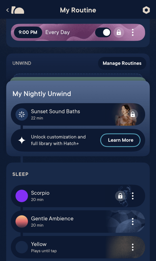 One of the most impressive parts of the Hatch Restore 3 is the ability to create fully customized routines. However this is a paid feature that you’ll lose access to after your free trial ends. I set one up while I was in the free trial, but now that I’m not paying for a plan, I can’t edit it (but it still works!)