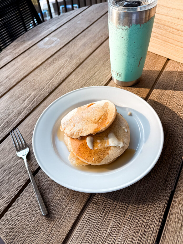 Pancake breakfast + Sardine salad with orange marmalade. Try it!!