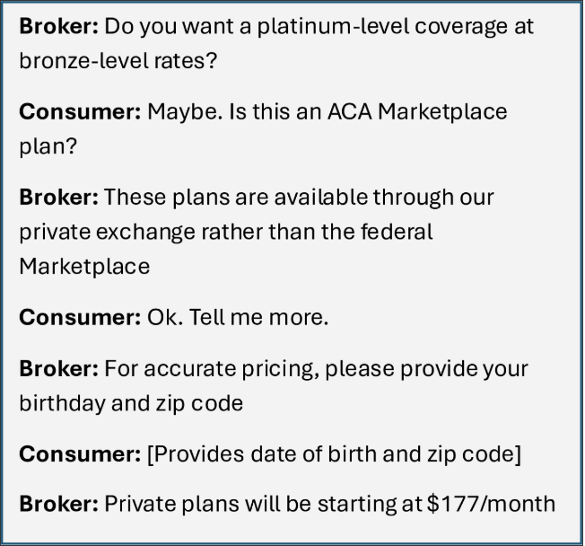 The implication is that the broker is selling a product on a “private exchange” that may be an alternative to ACA Marketplace coverage (the Marketplace is also sometimes referred to as an exchange, adding, likely intentionally, to the confusion). However, a call with this broker revealed that the products available on this private exchange are fixed indemnity plans. The broker noted that unlike a Marketplace plan, the private plan has no deductible or copayments, instead it provides “first dollar coverage” (meaning the insurer begins payment as soon as an insurable event occurs without requiring a patient to meet a deductible or pay out of pocket at the point of sale) and is available at a premium hundreds of dollars lower than Marketplace plans. While it is true that a fixed indemnity plan typically does not come with copayments or deductibles, this isn’t because a consumer has found the deal of a lifetime. It’s because the product is not designed like an insurance plan at all. With a fixed indemnity plan, consumers may pay nothing when they receive care, only to be saddled with a bill later when they learn the plan’s fixed dollar payment for the service received does not come close to covering the full cost, leaving the consumer responsible for the balance.