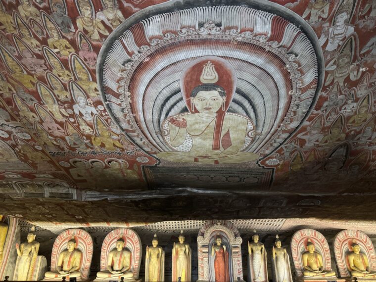 We threw ourselves straight into our Sri Lankan adventureβarrival day and allβfiguring weβd be exhausted anyway. Heading north, we stopped at the Dambulla Cave Temples (entry $10 USD), an unexpected βDay One WOW.β Five chambers of murals and golden Buddhas glow softly in the rock light, with purple jasmine offerings scattered below. How anyone painted those naturally curved ceilings remains one of lifeβs mysteries. The climb is steep (bring water) but absolutely worth it.