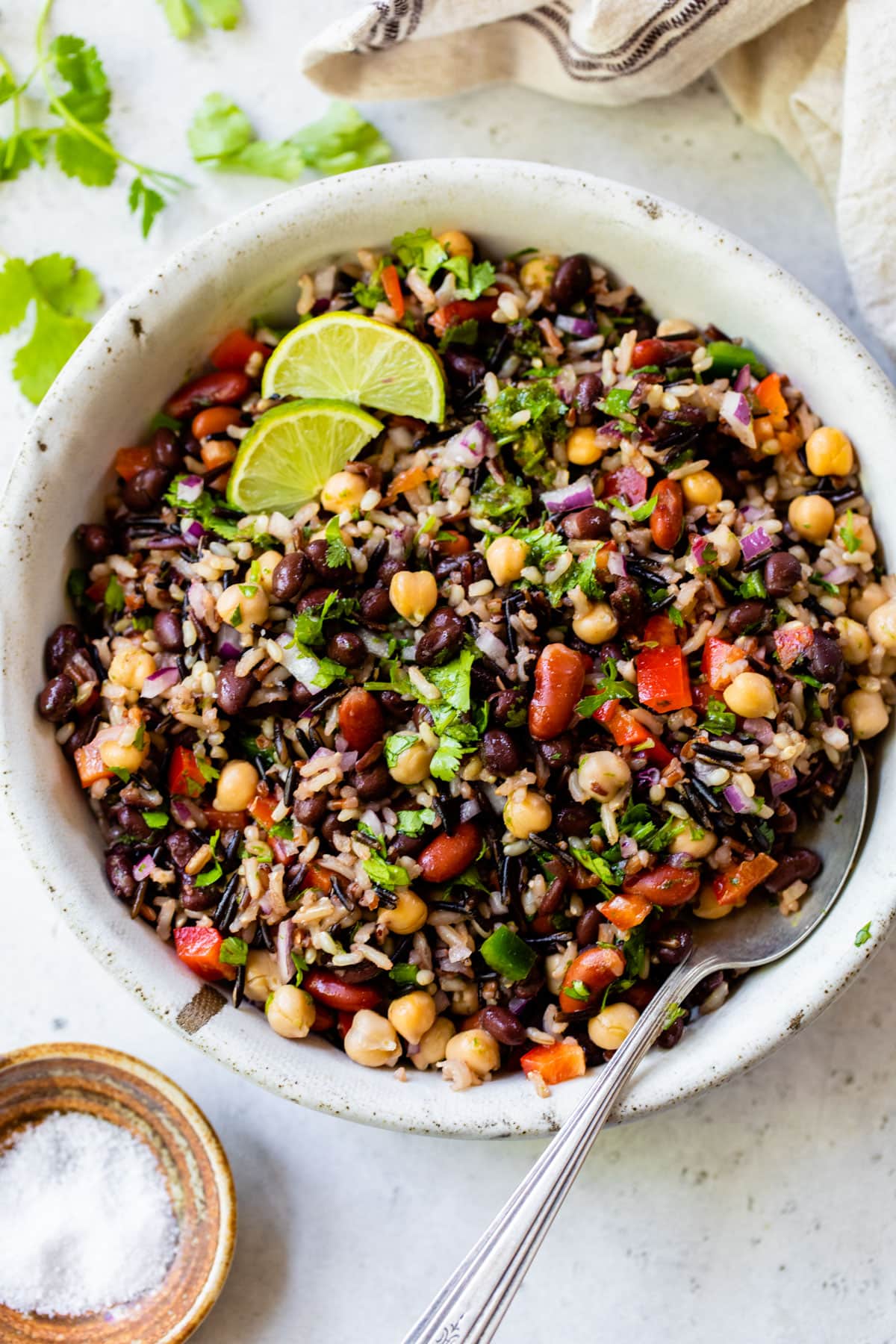 - Rice. I left the tame white stuff behind and opted for a whole grain brown rice (like in these Stuffed Peppers) and wild rice medley, which makes the three bean salad more filling (thank you fiber) and more dynamically flavored too.