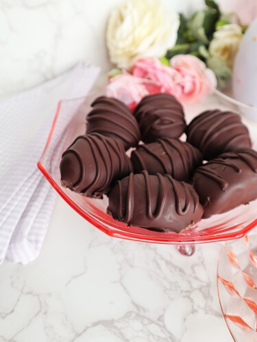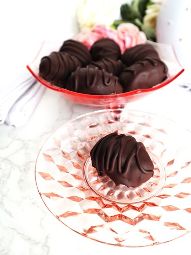 - Once the filling has firmed up, dip each chocolate into the dark chocolate, being sure to let the excess drain off, and place back onto the tray (I like to set mine on a fork to allow it to drain better). Once they are all dipped, set them in the freezer until hardened.