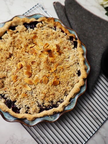 - Pour the cherry filling over the marzipan in the pie crust, then sprinkle the streusel over the top of that.