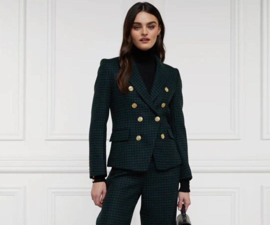 If the peplum is about form, the Knightsbridge is about presence. This wardrobe staple in Emerald Houndstooth is a vibrant, cinematic pop of colour against the Cotswold green, and finished with those signature gold Holland Cooper rivets.