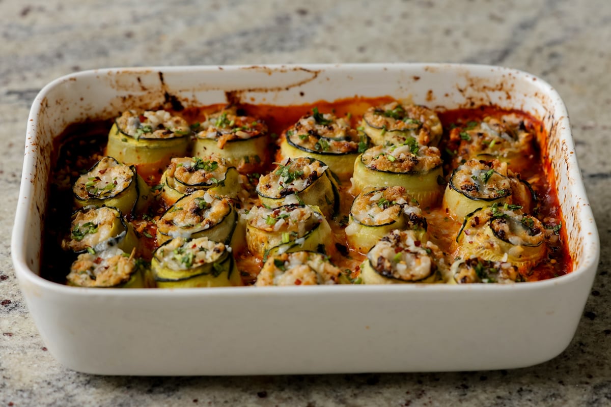 Leave at least an inch on both ends, so that it’s easy to roll. While you’re rolling, the filling might shift a little bit, which is why you want to keep an inch towards the other end, as well. Roll up the filled zucchini, and place it on top of the filling snugly in the pasta sauce.